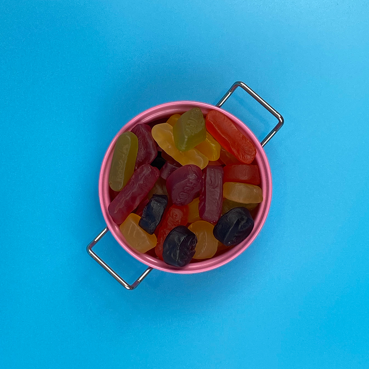Wine Gums: glucose syrup, sugar, modified maize starch, pork gelatine, acids: citric acid, lactic acid; colourings (E100, E120, E141, E153), flavourings, vegetable oil (coconut), glazing agent (carnauba wax).